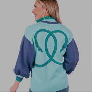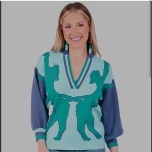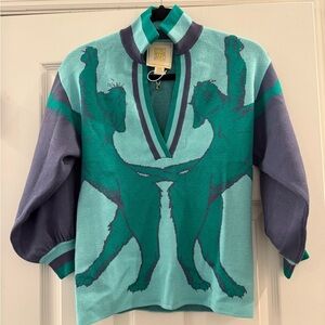Lolli sweater twist on a tunic, fretwork detail around neckline and folded collar. Cozy rich knit fit. Viscose knit. Classic stand collar with fretwork neckline, 3/4 blouson sleeve, straight slightly tailored body, stretch to it. Light green turquoise with lilac purple. Two lioness across the front graphic and their tails entwined on the back. Pullover style. Preppy chic. Luxury glam. Statement piece. Unique. Avant garde. Animal. Designed by Emily McCarthy in Savannah, Georgia. Viscose and polyester.