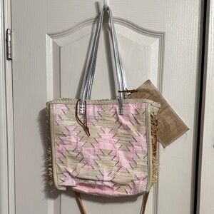 Meet your new summer sidekick! This En Shalla dreamy tote features a soft pastel tribal pattern woven with flirty fringe sides for a touch of boho glam, and eye-catching metallic straps that add just the right amount of sparkle. Whether you're heading to the farmer’s market, the beach, or just out to brunch, this tote brings the vibe and the space. New without tags but the bottom has been released from it's original square shape and there is light wear from when it was sitting in storage. Lightweight, roomy, and oh-so-stylish—it’s the bag that says “I’m effortlessly fabulous” without saying a word.