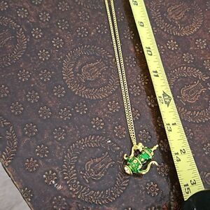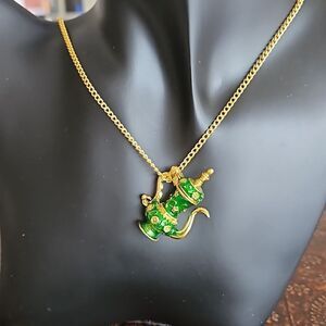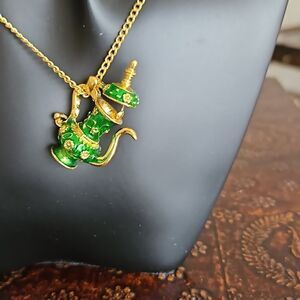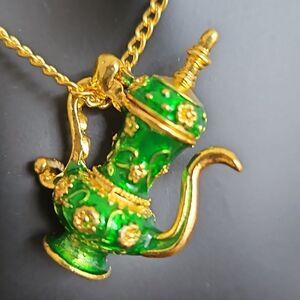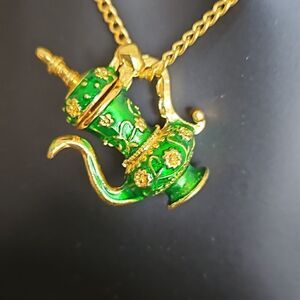 NWOT Unique enamel glaze green and gold toned teapot shaped pendant on a gold chain. The top of the teapot opens and closes.