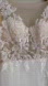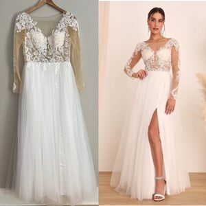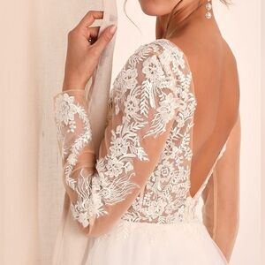 Sheer light nude tulle features lush floral embroidery as it shapes long sleeves that frame a sheer bodice with a boat neckline, atop lined cups with supportive padding. Deep V-back adds a elegant accent. Embroidered details cascade down to the fitted waist, continuing onto the three-layered white tulle skirt that has an A-line silhouette and a thigh-high side slit. Maxi hem completes the look. Hidden zipper/clasp at back.
