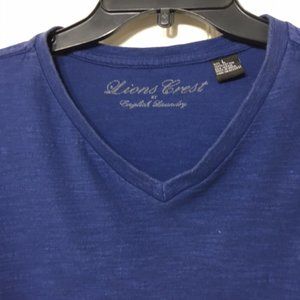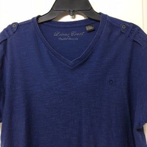 Features: 100% cotton, Lions Crest by English Laundry, stylish V-neck collar tee, buttons on 2 shoulder. Very soft and distressed navy blue fabric.