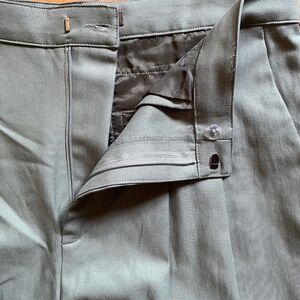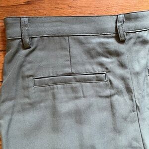 Self: 52% lyocell, 48% organic cotton.Lining: 100% rayon. Made in USA. Machine wash. Zip fly with hook and bar closure. Side slant and cargo style pockets. Pleated twill fabric. Please note: this item runs large, consider sizing down from your regular fit.