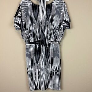 NWOT Etcetera Black/Bone/Gray Striped Cap Sleeve 100% Silk Lightweight Knee Length Dress with Material Waist Belt and Back Zipper Closure; Scoop Front Neckline with V-Shaped Back Neckline; Size 4; Main Picture shows Material Belt Hanging on Hanger; When lying flat, measures 19" pit to pit, waist 14", and 36.5" in length from top shoulder seam to bottom hem; Fabric and Care instructions shown in pictures