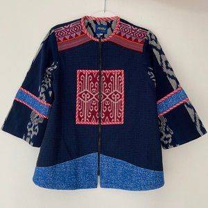 zip closures, 3/4 sleeves, structured fit, embroidered details on shoulders