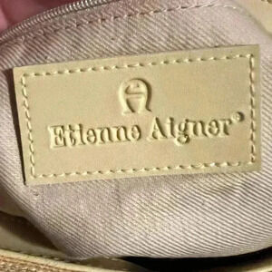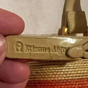 This vintage Etienne Aigner shoulder bag is a stylish addition to any wardrobe. The bag features a peach yellow and pink stripe pattern on the exterior made from durable jute material, with a nylon lining in a neutral beige tone. The hardware is accented with gold, adding a touch of sophistication to the design. The medium-sized shoulder bag is perfect for everyday use and is characterized by an earthy, natural feel. The handle and strap are also made from jute, creating a cohesive look throughout the design. This Etienne Aigner bag is a beautiful accessory for any woman looking to add a touch of vintage charm to her ensemble.
