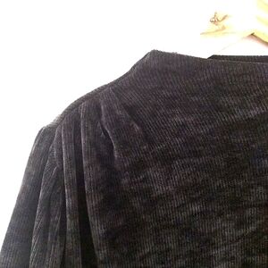 Beautiful soft black brush velvet Mockneck sweater with gathering on right shoulder, giving a basic look some shape and statement. Lighter velvet fabric and rushed sleeves. The perfect sweater paired with light wash jeans for the holidays fall and winter.