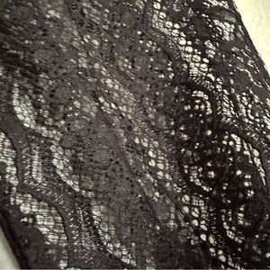 Black elegant lace dress from the brand Express. This dress features a mock neck, long sleeves with cuffs, and a scalloped hem. The dress is fully lined except for the sleeves, which are sheer, and has a visible seam at the waist. The lace pattern is consistent throughout the dress, and the fabric is soft and comfortable. New never worn without tags. Size S