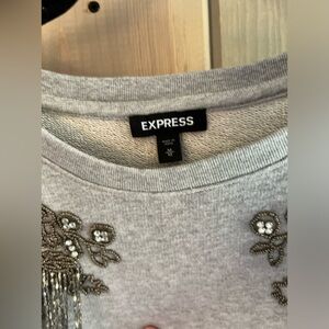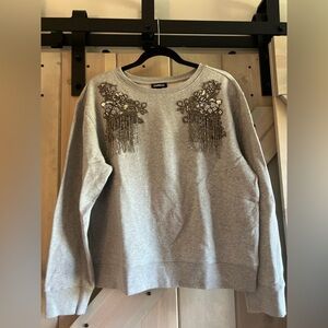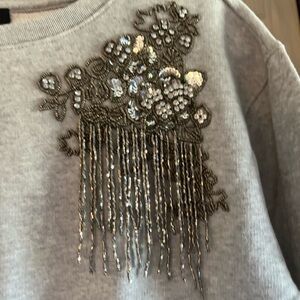 Body, slightly cropped fit grey sweatshirt made special with chest sequin details and sequin fringe. Never worn- really special and perfect for holidays! 100% cotton. (BIN3))