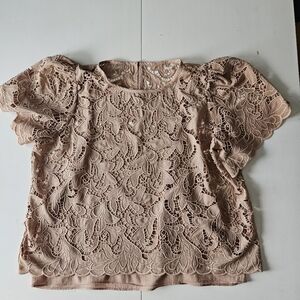 New without tags- Express top featuring embroidered floral overlay, puff sleeves with scalloped hem, matching string tank underneath that is attached to shirt and a keyhole button detail on back.