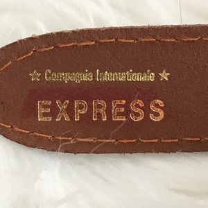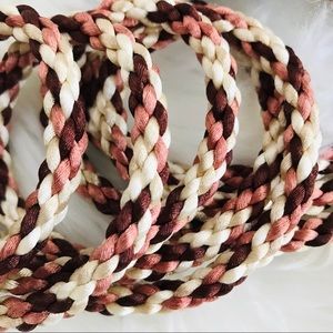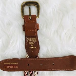 Express brown genuine leather belt with three-strand twisted rope in cream, pink, and maroon. Size large. Metal buckle.
