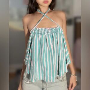 So femme from Free People’s We The Free collection, this classic halter top is featured in a soft 100% cotton fabrication and striped design with an open-back and adjustable halter tie detail. Hits at waistline on most.