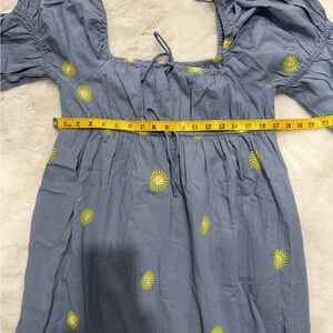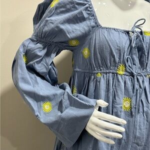 Features: Soft cotton-linen blend, square neckline, tie-front detailing, embroidered detail throughout, relaxed sleeves with elasticated detail, slit at leg