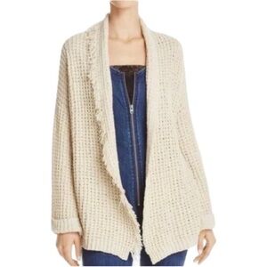 A beautiful cozy cardigan with a fringe accent along the collar on one side.
