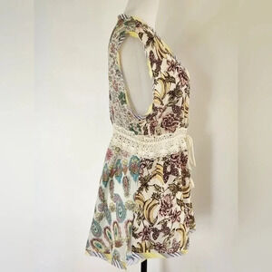 Nwot Free People Intimately Watching Waves romper in size small. Full of color and shapes this romper packs a punch. The front is one kind of fabric, the back is another and the raw hems are yet another. The waistband is crocheted lace with a rope belt with fun little tassels. This little romper wld look darling as a swim cover up.