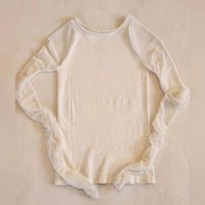Free People Intimately womens white stretchy shirt with sheer, ruched sleeves in size small. I bought this and never wore... the body of the shirt is nylon and spandex. Very stretchy. The sleeves are very long and are meant to be bunched up.