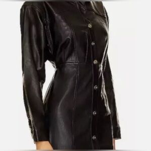 Free People Revolve 'Amber' Black Viscose Faux Leather Mini dress. Dress is unlined, front button closure, buttoned cuffs, faux leather fabric.