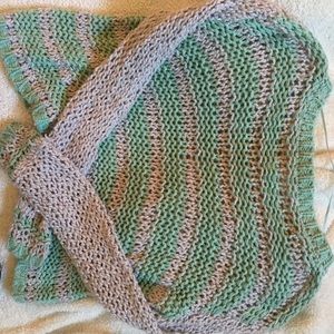 Perfect light weight sweater, very soft with cotton & silk. Colors are flattering & soft in a light sage/mint green & light grey/taupe. The large open weave is perfect for spring/ summer. This Free People sweater looks great with jeans, over a dress, skirt; very versatile. It hits about waist length on an average height woman. Great juxtaposition of romantic soft materials & soft muted tones with a "over-sized" boxy yet cropped-at-the-waist cut.