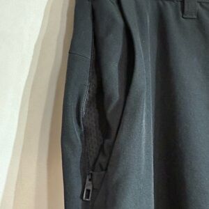 Lightweight solid black with snap zipper fly, inside drawstring, side zippered pockets. Never worn, excellent condition