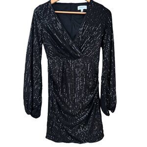 black sequin dress, bodycon mini dress, lantern sleeve dress, surplice neck, party dress, cocktail dress, going out dress, holiday dress, sparkle dress, Faeriesty dress, special occasion, women's dresses, size small