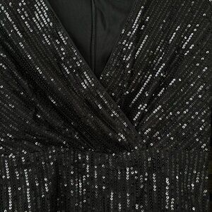 This stunning black sequin dress by Faeriesty features dramatic lantern sleeves and a flattering surplice neckline. Perfect for parties, cocktail events, nights out, holiday celebrations, or any special occasion where you want to sparkle!