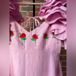 NWOT Fanm Mon Aster Pink Demre Linen Embroidered Maxi Dress Ruffle Sleeve SIZE S