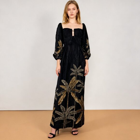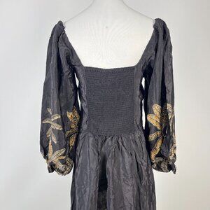 NWOT Farm Rio Maxi Dress Size M Black Print Puff Sleeves Plant Short Sleeve