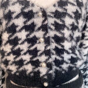 Cozy knit sweater with a black and white pattern. Soft texture and stylish design.