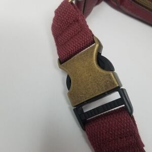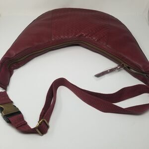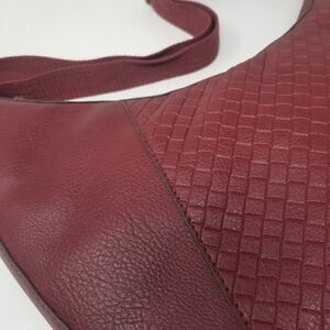 NWOT Soft burgandy faux leather crossbody hobo style bag. Crossbody with fabric strap and metal closure. Approximate measurements are 16" x 12" x 1.5". Maximum strap length is approximately 39".