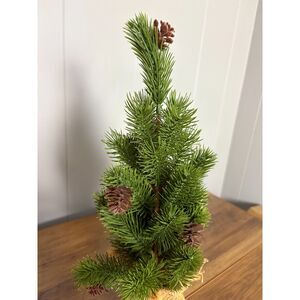Beautiful faux pine tree perfect for tabletop displays and holiday decorating. Features realistic green pine needles and a sturdy weighted base for stability. Ideal for creating festive winter scenes and Christmas vignettes.
