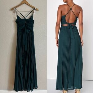 Lulus Feeling Marvelous Emerald Green Pleated Tie-Back Maxi Dress •Airy, pleated woven chiffon shapes this dreamy dress that features a sleeveless bodice •V-neckline, supported by adjustable spaghetti straps that crisscross at the back. •Slender tying sashes secure atop the flirty open-back design. •The fitted waist tops a breezy A-line skirt that falls to a sweeping maxi hem. Hidden back zipper/clasp.