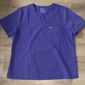 Stylish V-neck scrub top by Figs. Features a convenient chest pocket. Ideal for healthcare professionals.