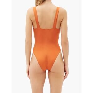 NWOT Fisch S Rajalin Zigzag Cutout Swimsuit Shimmer Terracotta Orange. Made in Italy. Hygienic liner was intact when purchased but was removed to hand wash due to a small spot on front that did wash out. No flaws to note.