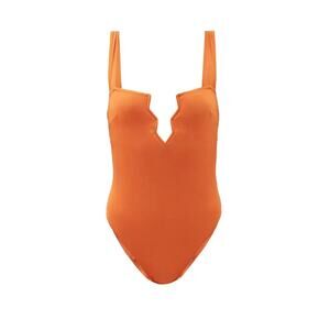 “Fisch creative director Agnes Fischer studied at Parsons School of Design in New York, formative expertise that's reflected in the artistic cut of this orange Rajalin swimsuit. It's crafted in Italy from a recycled polyamide blend with a square neckline accented by a zigzag-shaped cutout and high-cut legs.