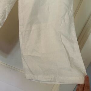 Elegant creamy white linen pants by Flax size large with flat front waist, and elastic back of waist. There is a mark on the label, and see photo with faint, tiniest dot of something that may come out on backside, but I have not worn or washed these. New without tags, non-smoking, pet friendly home.