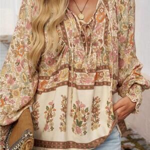 Go boho or go home! ;) Boho style, pale pink, mauve, gray and pale yellow floral blouse. Lantern sleeve. 100% polyester. Love!!!