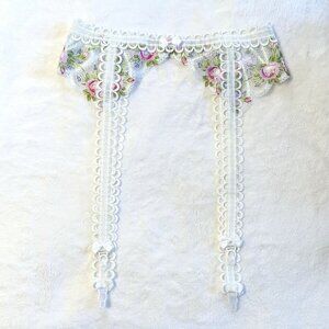 With intricate rose embroidery and oversized loop trim, this garter belt channels the charm of a summertime rose-covered trellises to give this piece the perfect finishing touch.
