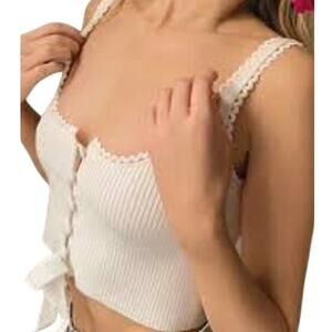 NWOT. Never worn. Creamy white cropped ribbed knit tank with bottom bow. Lace trim detail.