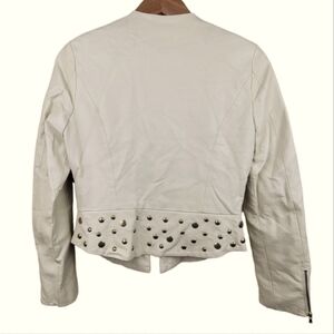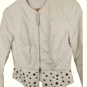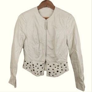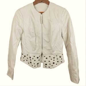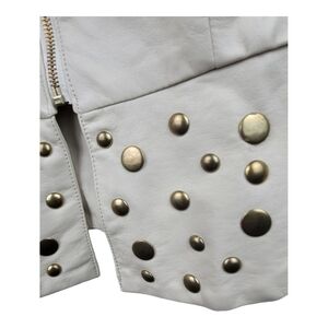 Forever 21 Exclusive, Faux Leather, Zip Sleeves goldtone studded Jacket, features "apron" front...longer in front than back, 19" pit to pit, 21'5 front shoulder to hem,