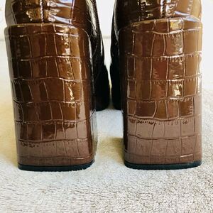 Beautiful faux alligator print patent leather block heel square toe platform high ankle boot.