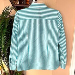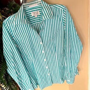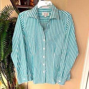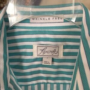 NWOT Foxcroft Wrinkle Free Button Down Blouse Collared Teal & White Stripes. 100% Cotton.