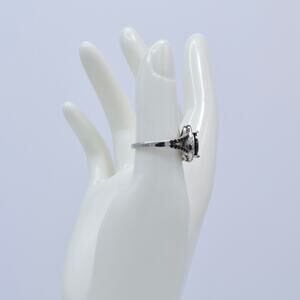 The band features a split-shank design with additional black stones set along the sides, complementing the overall dark and luxurious aesthetic. The combination of the black and clear stones, along with the elegant pear-shaped design, gives this ring a sophisticated and edgy look. The rhodium-plated band adds to the sleek and polished finish. This ring would be perfect for someone who enjoys bold, statement jewelry with a refined, modern edge.