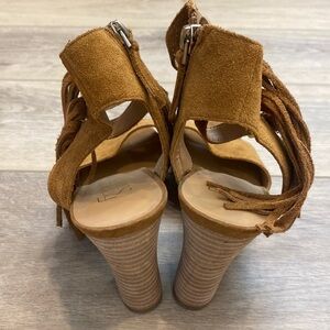 Boho beautiful buffalo bill Tan Suede fringe ankle strap Block Herls by Franco Sarto. The functional three strap ankle wrap features gold buckles for a perfect fit and fringe ends that add fun movement to these casual heels. The block heel is stacked leather wrapped and a comfortable 3.5" tall. The interior features a zipper for easy and convenient on off. Super fun peep toe heels with tons of western charm. In New Without Tags Flawless condition, Size 7