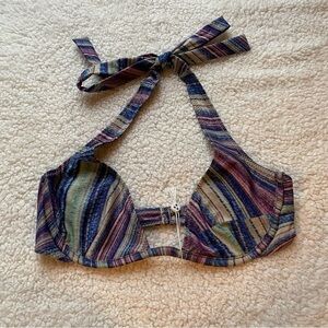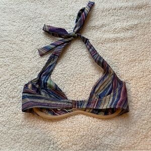 The Stardust bikini top. Our first halter and underwire bikini top. Combining style and support, featuring an adjustable neck tie and a hook and eye back closure. This bikini top will have you feeling extra cute and supported in one. Designed in our newest lurex fabric.