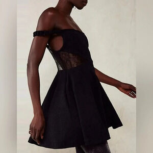 So femme and made for every occasion, this flattering mini is featured in a textured fabrication and off-the-shoulder silhouette with sheer lace detailing and classic