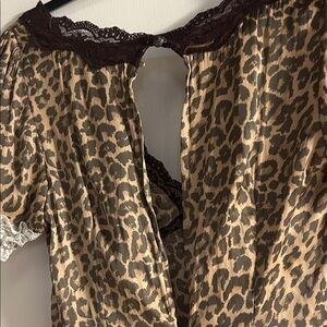 Stylish animal print chemise with lace accents. Soft fabric for a relaxed fit. Ideal for lounging. New without tags, but it is missing a button on the back probably just by being on the rack.