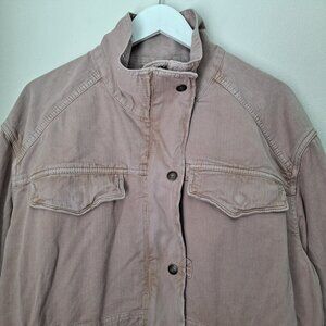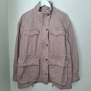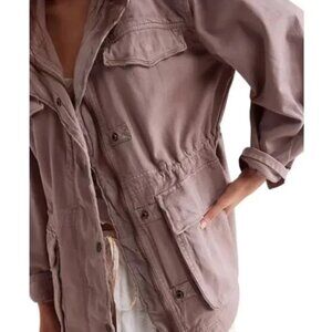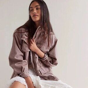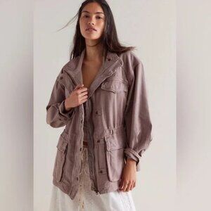 New without tags. Free People We The Free Arya utility jacket in size S (may run big - see measurements). Stand collar. Dropped shoulders. Zipper with snap closure. Flap pockets. Adjustable drawstring waist. Cotton fabrication. The inside tag has been crossed out.