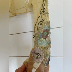 Sheer mesh long-sleeve featured in a slightly cropped fit with a higher neckline and intricately embroidered detail at the cuffs.