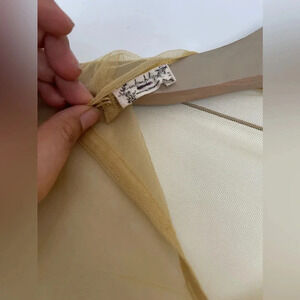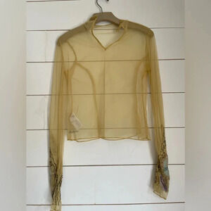 Features: Sheer mesh fabrication, higher neckline, keyhole cutout at back with a button-closure, seam detailing, embroidered detailing at sleeves