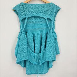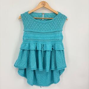 NWOT Free People Blue Juliette Ruffle Top, Sz Small, Linen Boho Knit Hippie