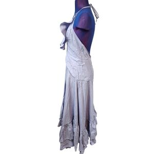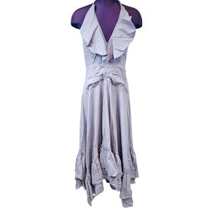 Features Free People Clara lilac cotton midi dress, halter adjustable neck tie with gold embellishments, side boning for additional support, v-neck with ruffle placket, sleeveless, asymmetric bottom ruffle hem, open v-back with wooden button closure, boho chic, cottage style.